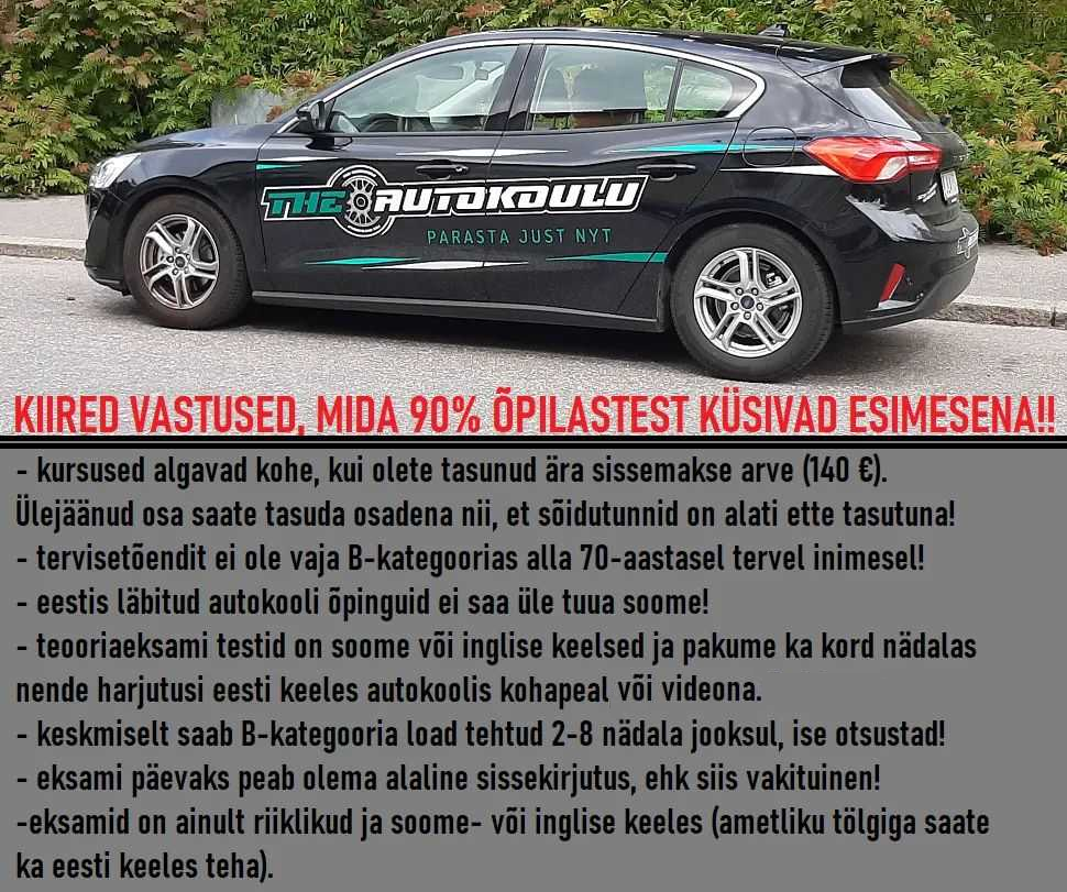Õpetus: kohustuslikke teooriatunde on 4 ja need toimuvad eesti keeles e-õppevormis ja soome keeles 3x nädalas. Sõidutunde 5.